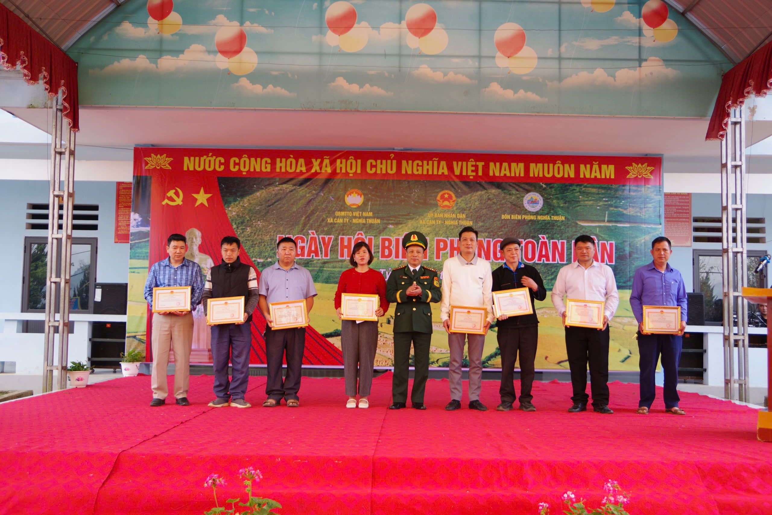 Cũng tại ngày hội, Ban Chỉ huy Bộ đội Biên phòng tỉnh tặng Giấy khen cho tập thể, 6 cá nhân có thành tích trong thực hiện “Ngày Biên phòng toàn dân” và Phong trào toàn dân tham gia bảo vệ chủ quyền lãnh thổ, an ninh biên giới quốc gia năm 2025; tặng 84 suất quà cho các hộ gia đình thực hiện tốt Chỉ thị 01/CT-TTg, các hộ gia đình chính sách, hộ nghèo và 16 xuất quà cho các em học sinh trong Chương trình "Nâng bước em tới trường - con nuôi Đồn Biên phòng" trên địa bàn 2 xã Cán Tỷ, Nghĩa Thuận.