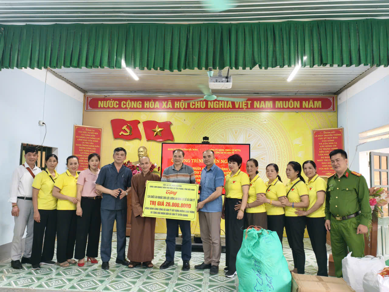 các đồng chí trong thường trực Đảng ủy, HĐND, UBND, UB MTTQ, các mạnh thường quân, nhà hảo tâm và Câu lạc bộ Thiện nguyện chùa Linh Quang thăm các con đường hạnh phúc và tặng quà cho thôn