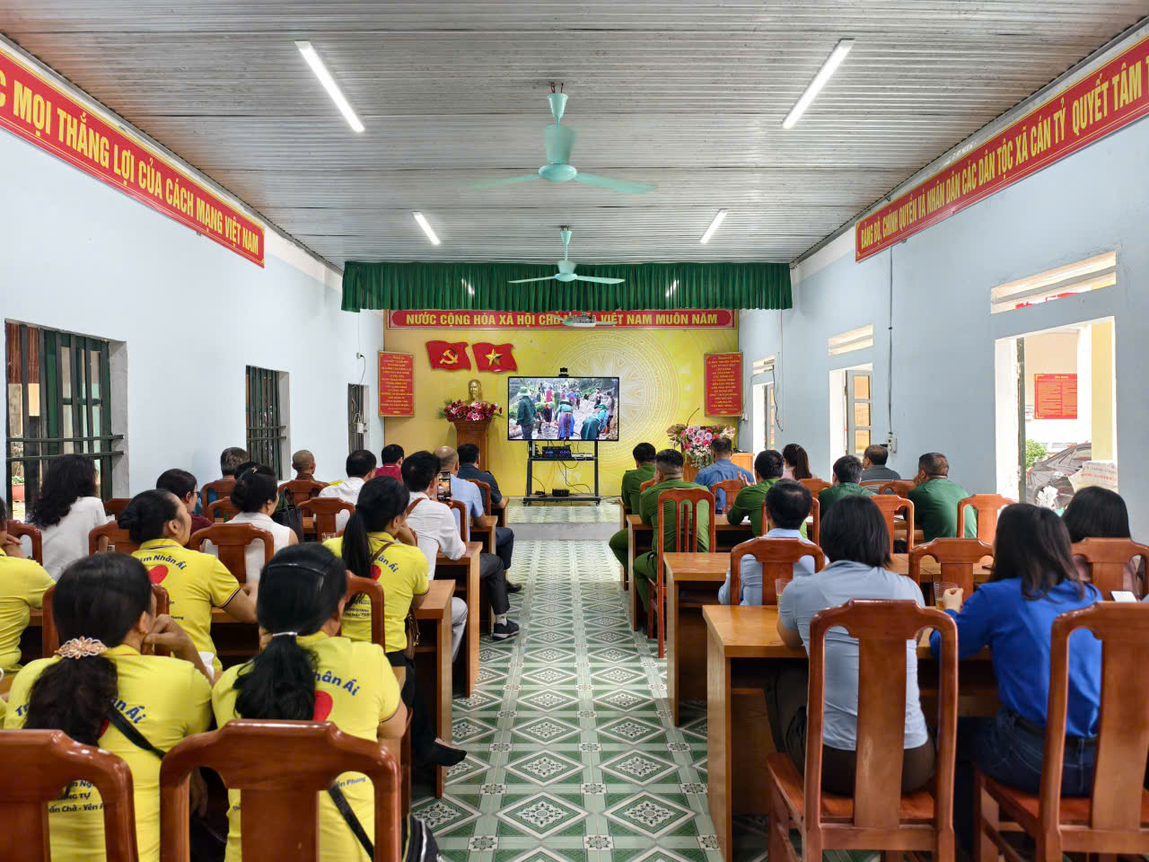 các đồng chí lãnh đạo xã và đoàn từ thiện xem phóng sự những con đường hạnh phúc